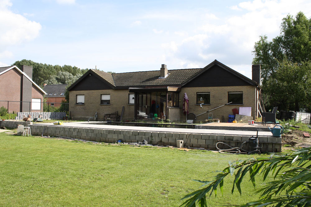 De bestaande woning uit de jaren ’70 werd volledig verbouwd. Een nieuw gedeelte werd aangebouwd zodat er een L-vormig volume ontstaat rondom de bestaande koivijver. Het terras met de vijver wordt op die manier een meer geborgen ruimte